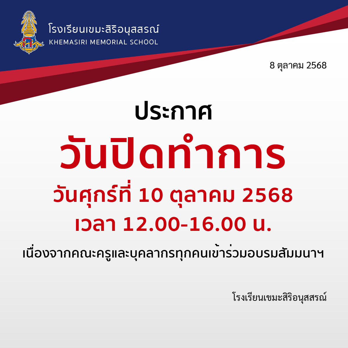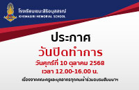 ประกาศ 8 ต.ค.68>> แจ้งวัน-เวลาปิดทำการ ในวันศุกร์ที่ 10 ตุลาคม 2568 เวลา 12.00-16.00 น. เนื่องจากคณะครูและบุคลากรทุกคนเข้าร่วมการอบรมสัมมนาฯ